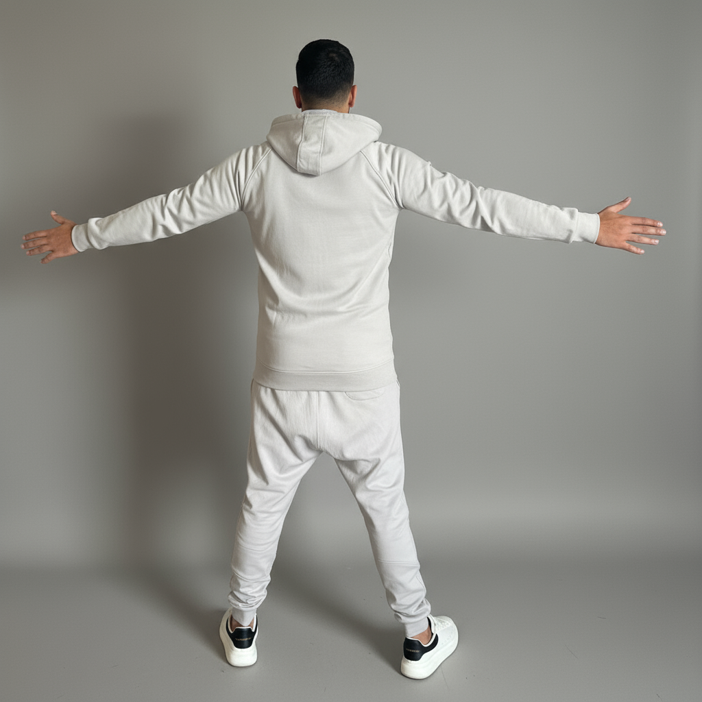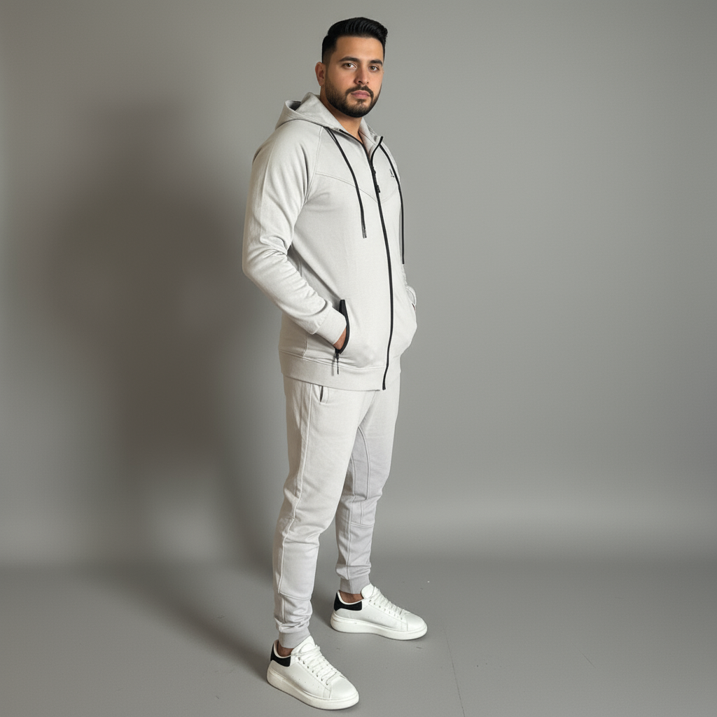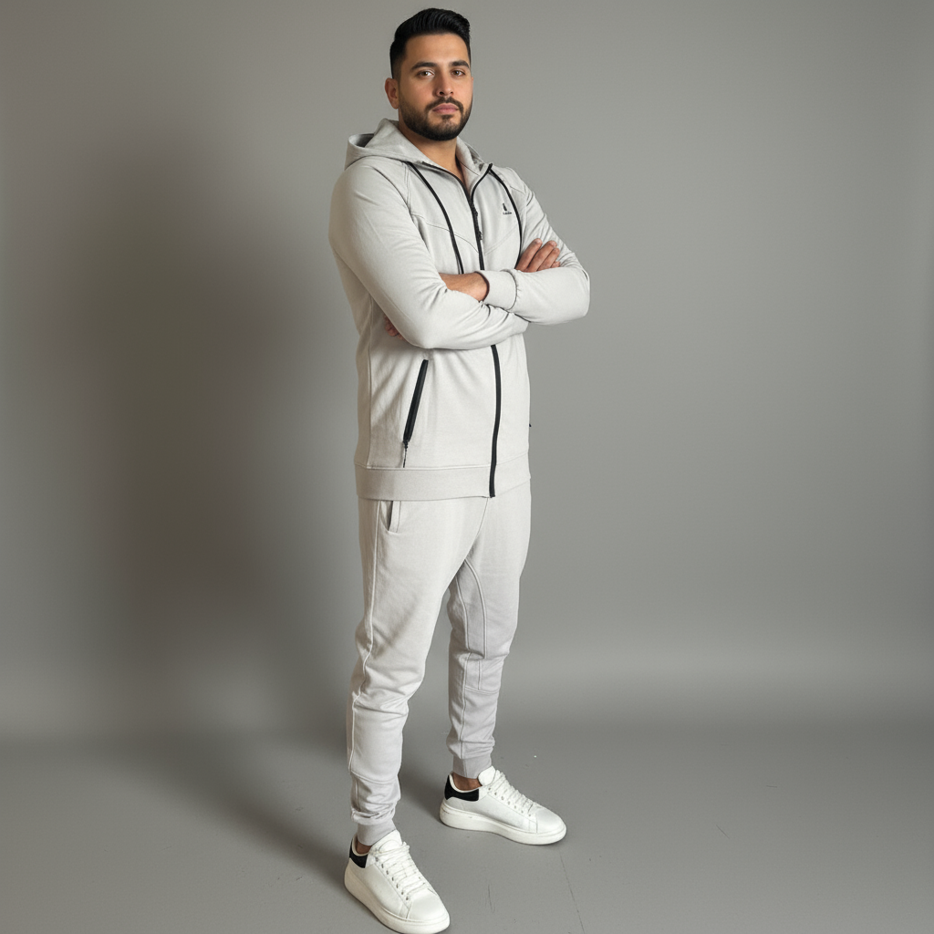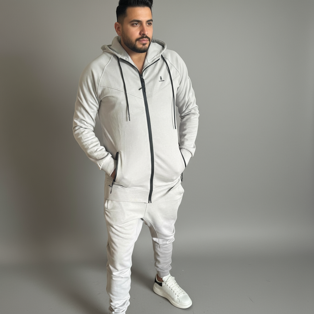 Ensemble ILRAYA Nimbus Zip gris : veste zippée + bas assorti, coupe nette et confort quotidien.